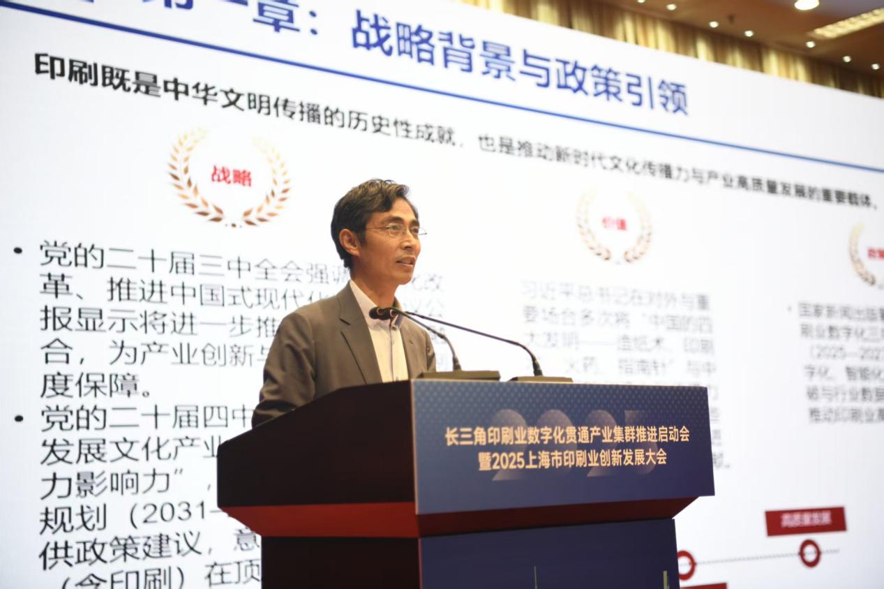 11月15日,长三角印刷业数字化贯通产业集群推进启动会暨2025上海市印刷业创新发展大会在青浦举行。中宣部印刷发行局印刷复制处处长、二级巡视员路洲,青浦区委常委、宣传部部长陈建国出席。学校印刷与包装工程学院院长齐元胜受邀作专题报告《我国印刷数字化转型与智能化发展》。