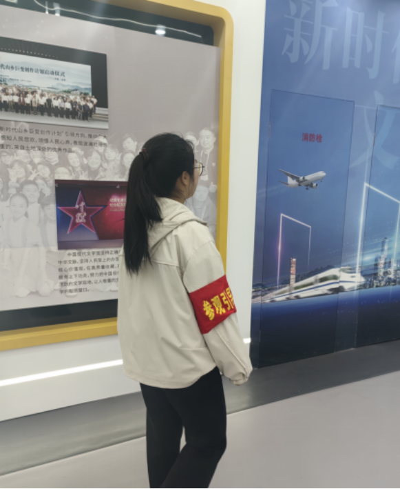记得第一次服务前,我们通过线上培训认真学习了场馆布局和服务规范。正式上岗时,佩戴着鲜红袖标的我们,成为了馆内一道亮丽的风景线。初春时节,文学馆庭院里的海棠开得正好,赏花的游人络绎不绝。作为文明劝导员,我不仅要提醒大家注意安全,更要轻声细语地劝导游客爱护花草。看着游客们会意地点头微笑,我的心里也暖暖的。后来我被安排在馆内做参观引导工作。穿梭在文学大师的手稿和著作之间,我常常不由自主地放轻脚步。遇到大声说话的参观者,我都会微笑着做个“嘘”的手势。每一个轻声的提醒,每一次耐心的引导,都是在为守护这座文学殿堂贡献自己微薄的力量。