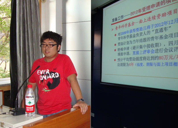 之后重点就教师们最关心的2012年申请中的注意事项:准备工作、撰写须知、材料提交、其他补充等四部分进行详细介绍。详细介绍了项目类别、申请人条件、撰写须知、在线填写项目类型、查重、申请代码、合作单位信息、经费预算、提纲、签字盖章页、附件、材料提交步骤、特别注意分组原则与方案、专家维护与选取、评审意见与返修、评审专家的打分。重点介绍在申报过程中重要事项及容易出错的地方,全体教师很专注地听讲,首次对国家自然基金的申报工作有了系统的了解。