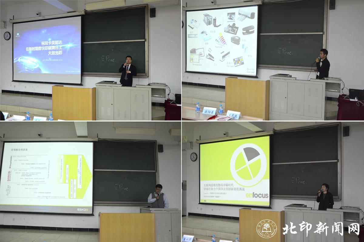 柯尼卡美能达销售课课长何义军先生、爱色丽应用工程师张波先生、Enfocus大中华区业务负责人Lisa女士、Esko华北区客户经理张翼先生,分别结合各自公司案例与到场师生就印刷包装设计、包装客户体验、营销思路,一幅幅创意印刷包装设计图触动心弦,简单的演示却展现了巨大的产业发展空间。