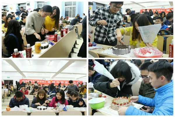 随着"班级口号齐声喊"环节各班同学纷纷喊出自班口号,比赛正式开始。比赛共分三个环节——蛋糕及蛋糕盒的制作,游戏大作战和荣誉之战。三个环节同时进行,现场非常热闹。在蛋糕及蛋糕盒制作环节,各班参赛人员都十分用心地制作蛋糕,嘉宾们也纷纷动手,发挥奇思妙想,齐心协力做出了两个精美的蛋糕。