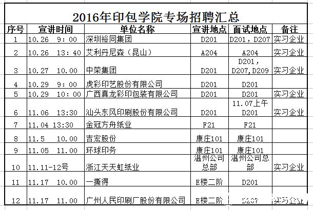 为构建"资源共享、双向服务、双向共赢"的校企合作模式,进一步加强校企在人才培养、选人用人方面的联系沟通,形成以实习促毕业生就业的工作模式,通过实习工作与企业建立了良好的合作关系,印刷与包装工程学院以学校秋季双选会为契机,自2016年10月26日到11月17日,先后联系12家印刷包装类的企业进行专场宣讲招聘,并首次带有意向到天天虹纸业就业的学生进入企业现场交流。