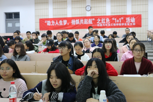 10月19日晚7:00,印包学院学生党支部与首都师范大学外国语学院英文系本科生党支部联合在E楼1阶举办了以 "助力人生梦,扬帆共起航"为主题的英语学习辅导讲座。本次讲座由首师大英文系学生党员郝真贞和刘苗主讲,印包学院17级印刷工程新生参加了本次讲座。