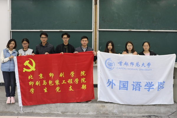 讲座结束后,印包低年级学生党支部与首都师范大学外国语学院英文系本科生党支部进行交流和合影。本次活动以红色"1+1"活动为平台,响应了北京市教工委关于做好学业辅导相关工作的要求,提高了17级新生学习英语的兴趣及其英语四级应试能力,同时进一步促进了两个学生党支部以后合作共建相关活动的开展。