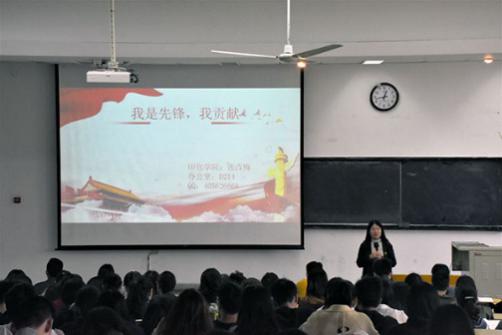 张改梅首先向大家讲述了新形势下高校学生培养的新要求,学生党员、干部应发挥的模范作用,并以“我是先锋,我贡献”为题展开了演讲。