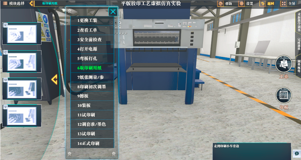 1.《平版胶印工艺虚拟仿真实验》(课程负责人:杨永刚;团队成员:魏先福、刘江浩、张婉、顾灵雅):该虚拟仿真实验课程是为适应我国高等教育和印刷产业发展的需求,以培养具有较强生产实践能力的创新应用型印刷人才为目标,坚持“学生中心、问题导向、学科融合、创新实践”的实验教学理念,按照“能实不虚、虚实结合”的原则,以海德堡胶印生产流程和规范操作为主要实验内容,采用3D建模、动画、音效、人机交互等技术,自主研发的平版胶印工艺虚拟仿真系统,系统包括开机前安全检查、参数设置、印版安装、墨量调整、套准调整、预印刷、正式印刷、设备清洗等操作工艺要领,能有效解决印刷工程专业实践教学过程中设备不足、成本高、实验材料消耗大的问题。