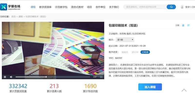 2.《包装印刷技术》(课程负责人:张改梅;团队成员:许文才、梁丽娟、刘省珍、鲁建东):该课程以包装印刷技术为核心内容,教授包装印刷技术基础知识,包括印刷复制原理和油墨传递与转移原理、印刷质量检测等。在此基础上讲授各种制版工艺与质量控制,重点讲授胶印、凹印、柔性版印刷、丝网印刷和数字印刷的印刷原理、印刷设备、印刷工艺、质量控制及应用,突出不同包装印刷工艺的特点,以包装印刷技术在纸包装、塑料包装等方面的应用,包括包装印刷流程、表面整饰和成型加工,包括纸制品、塑料制品、金属制品及玻璃陶瓷制品的印后加工工艺及方法,讲授上光、覆膜、烫金、模切压痕等加工原理、加工设备、加工工艺及应用,使学习者熟悉包装印后加工的特点、加工工艺和质量控制方法,基本掌握正确进行包装印刷技术的合理选择和主要印刷要素的确定。