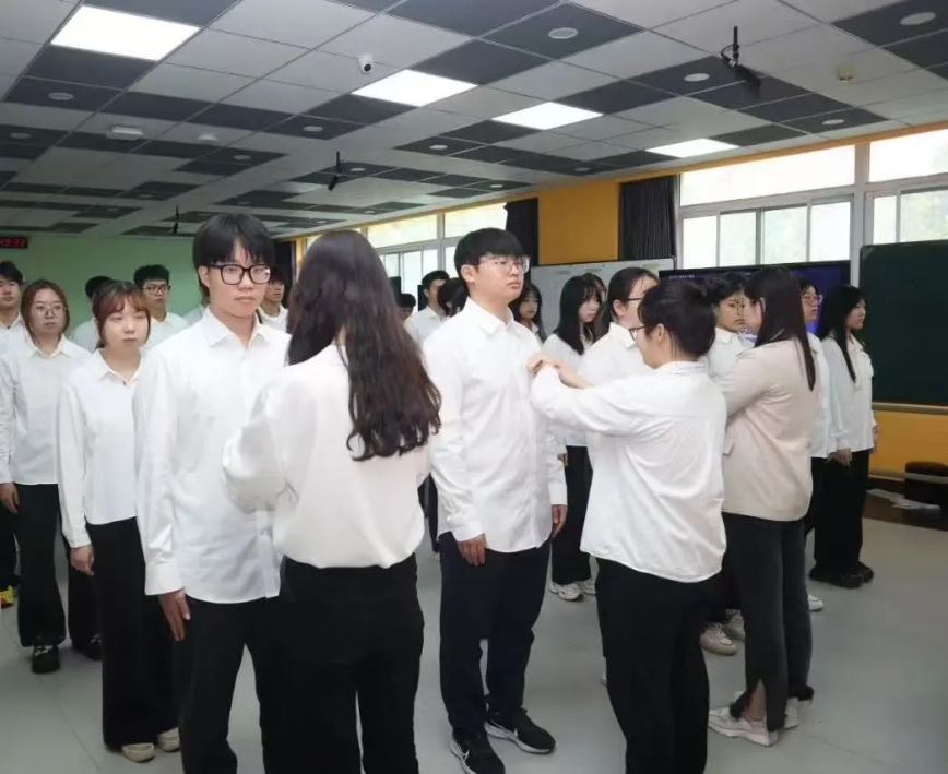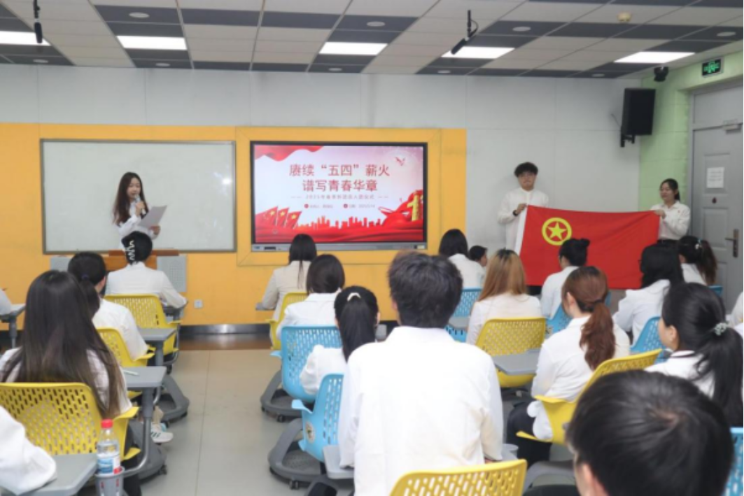 活动在庄严的国歌声中拉开序幕,全体师生肃立高唱,展现了新时代青年昂扬向上的精神风貌和炽热的爱国情怀。随后,主持人宣布新团员名单,本次共发展37名新团员。曹瑀濛、王硕和优秀团员代表共同为新团员佩戴团徽。闪亮的团徽承载着荣耀与责任,37名青年以崭新的身份,正式成为共青团的光荣一员。