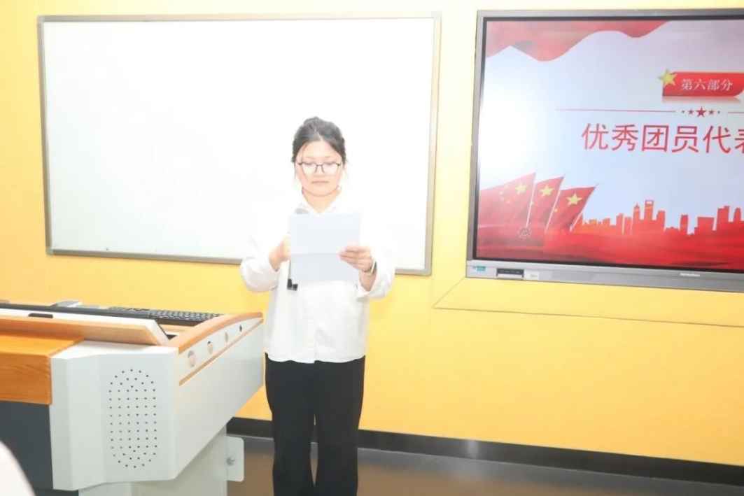 新团员代表邓仪曼在发言中满怀激情地表达了加入共青团的光荣与自豪。她郑重承诺,将始终以共青团员的标准严格要求自己,在坚定理想信念、勤奋学习求知、热心服务同学等方面发挥先锋模范作用,用青春的热忱和踏实的行动,践行"请党放心,强国有我"的青春誓言,展现新时代共青团员的昂扬风采。