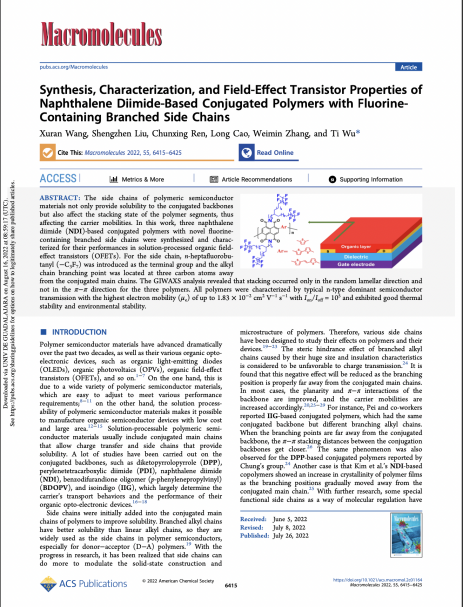 课题组从“侧链工程”出发,设计合成了一类新型的基于萘二酰亚胺-噻吩衍生物的聚合物半导体,侧链为氟基封端的长链燕尾烷烃,氟原子的引入改善了聚合物半导体材料的热稳定性和环境稳定性,获得了空气中稳定的n-型聚合物半导体,构筑有机场效应晶体管的电子迁移率为1.83×10-2 cm2V–1s–1,开关比Ion/Ioff 达到105。这一成果发表在Macromolecules上(Macromolecules,2022, 55, 6415−6425.)该工作是在北京市自然科学基金面上项目(2172024), 校级创新团队项目(Ea202202),北京市教委一般项目 (KM202110015008,KM201410015004)的支持下完成的。文章的第一作者是王旭冉(研究生,毕业),通讯作者是吴倜副教授,参与工作的研究人员还包括刘省珍老师,任春兴(研究生,在读),曹龙(研究生,在读)和张伟民教授。