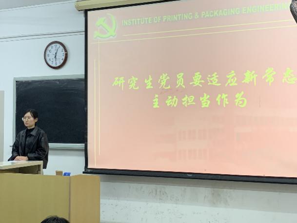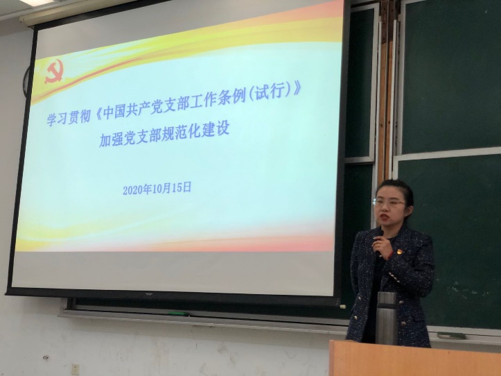 包装学生党支部书记尹玉璐老师于e楼3阶教室开展了“书记讲党课”活动。本次活动主要面向党员、预备党员以及新一批入党积极分子和党员发展对象,主要介绍了如何加强党支部的规范化建设。尹玉璐老师详细讲解了入党流程及与党支部相关的知识,其中包括“三会一课”三会一课的含义、党支部名称的命名及党徽的构成内涵等。活动中,尹玉璐老师向在座部分同学做出了提问,并对未答出正确答案的同学及时做出了订正,其他同学们在仔细聆听的同时,也做了详细的记录,并通过本次党课收获了更多有关党支部的基本知识。