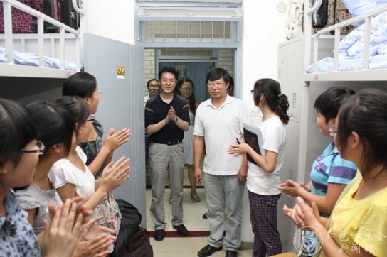 图为院领导到新生宿舍看望新生,关心他们的生活情况