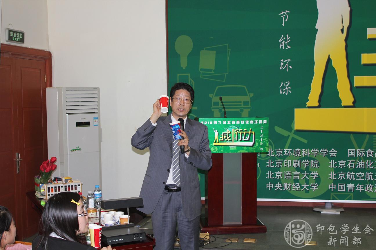 首先,北京环境科学学会理事长潘曙达代表主办单位致辞并宣布“2012第九届北京高校健康环保周”开幕,并强调大学生是社会知识群体的主流,有责任全面了解一次性用品的利弊,更有义务承担起节约资源和保护环境的社会重任。接下来,许文才校长代表北京印刷学院致欢迎词,介绍了学校基本情况及绿色包装产业的发展前景,并对主办方及参赛队伍表示热烈的欢迎和衷心的感谢。最后,国际食品包装协会秘书长、著名环保专家董金狮教授做了“健康环保,从我做起”主题演讲,并回答了在场学生相关问题。